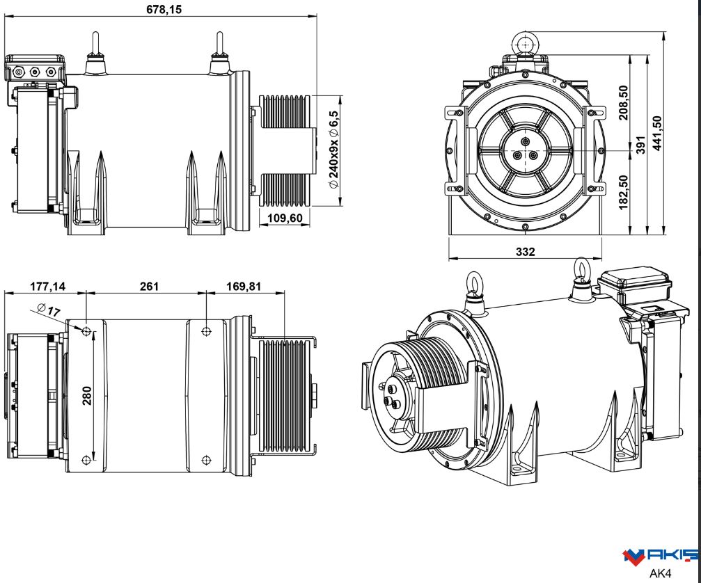 AK4 dişlisiz motor makinesinin kabin hızı 0.63 - 2.5 (m/sn) arasında değişkenlik gösteren bir hıza sahiptir. 1.8 - 17.1 kW arasında değişen güçle çalışan AK4 dişlisiz makinesi 20 Pole kutuba sahiptir. Kapasitesi 400Kg - 1000Kg arasında olan AK4'ün seyir mesafesi 51 metreye kadar olup ve 1:1 - 2:1 askı tipleriyle kullanılmaktadır. Verim açısından %82-90 arasında verim sağlayan AK4 asansör motoru çapları 320mm - 400mm olan kasnaklar kullanılabilmektedir.